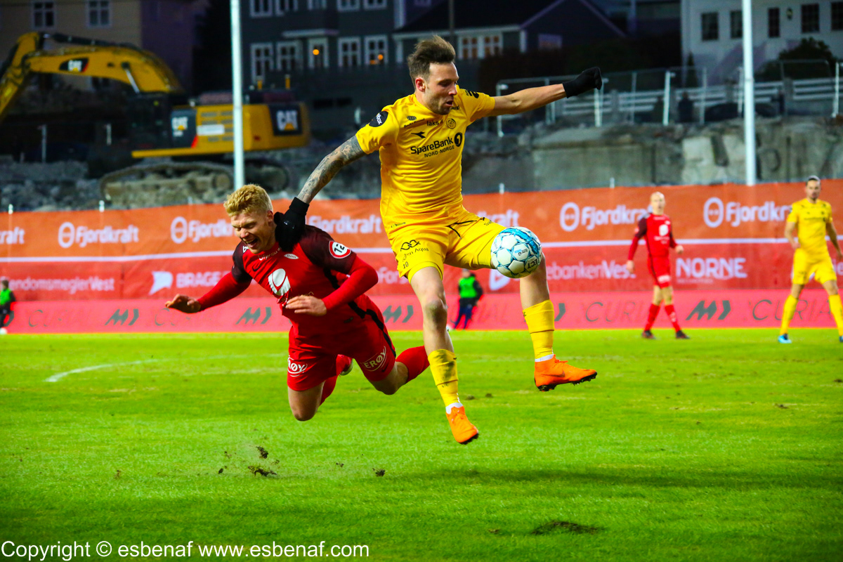 Brann's striker Steffen Lie Skålevik is fighting to get pass Bodø/Glimts defender. Without luck.